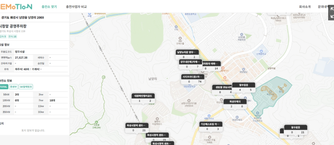 화성시 전기차 충전시설 위치 안내 시스템 구축경기 화성시는 전기차 충전시설 위치 등을 확인할 수 있는 '전기차 충전시설 통합 관리 스마트 시스템'을 구축, 본격 운영에 들어갔다고 28일 밝혔다. 포털 사이트에서 '이모션플레이스'를 검색해 접속하면 관내 1만1천455개 급속 및 완속 충전시설 현황과 시설 유형, 충전 속도, 충전기 타입, 충전 사업자 등을 한눈에 확인할 수 있다.