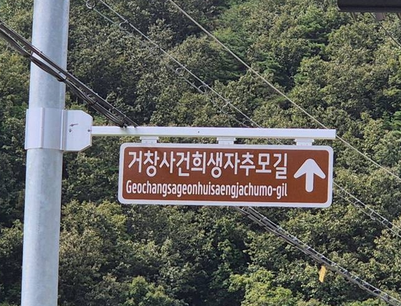 거창군 역사와 관광을 새긴 명예도로명 부여 거창군은 지난달 29일, 신원면 일원 도로구간에 ‘거창사건희생자추모길’과 ‘별바람언덕길’의 명예도로명을 부여하고 주소정보안내시설(도로명판)을 설치했다고 밝혔다.