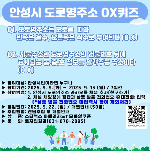 안성시, 9~15일 '도로명주소 OX퀴즈 이벤트' 추진'도로명주소 OX퀴즈 이벤트'는 도로명주소를 재미있게 이해하고, 친숙하게 받아들일 수 있도록 마련됐다. 안성 시민이라면 누구나 이벤트에 참여할 수 있으며, 정답자 중 추첨을 통해 50명에게 경품을 제공하고, 당첨자는 오는 22일 개별연락한다.