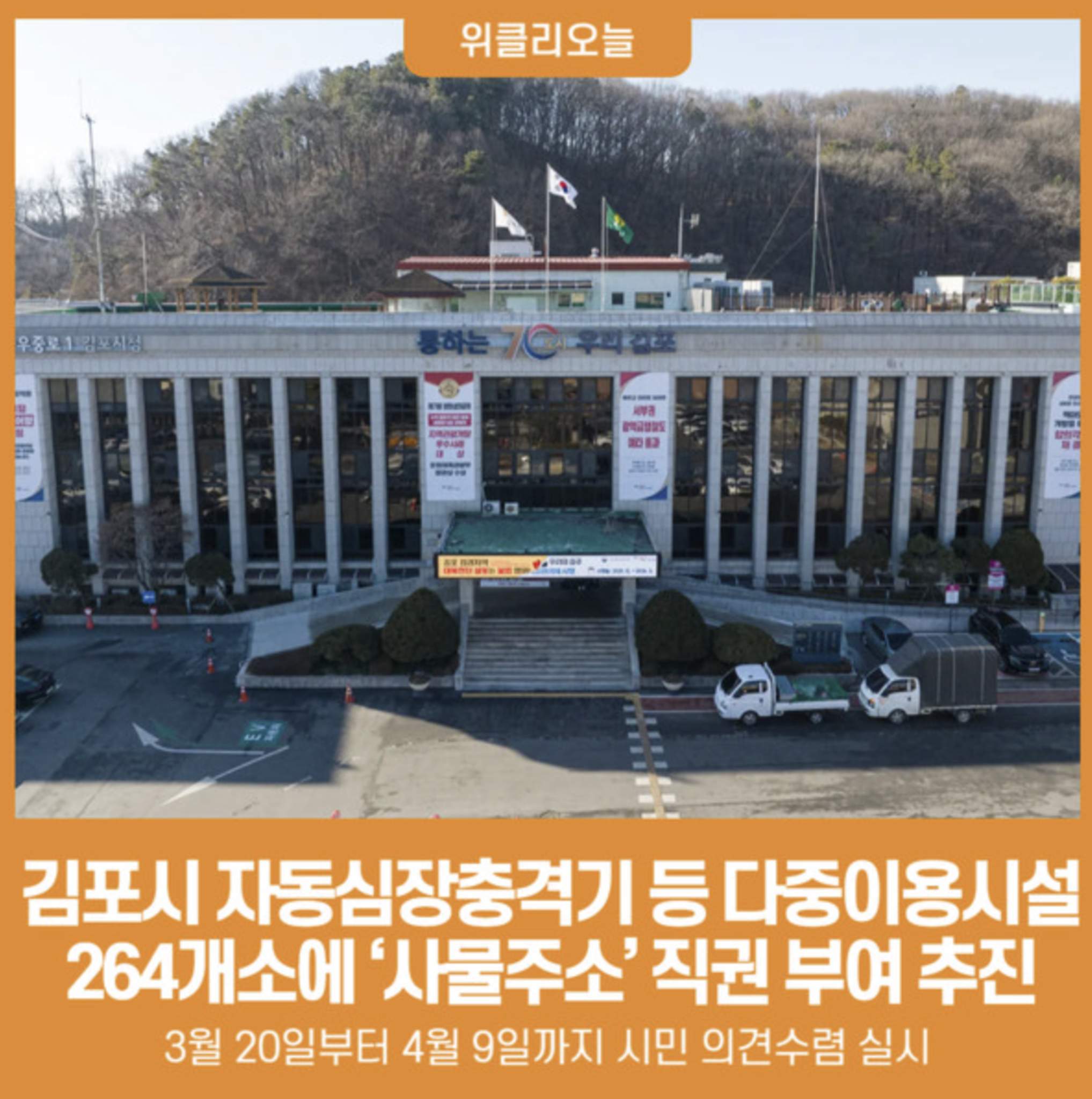 김포시, 다중이용시설 264개소에 ‘사물주소’ 직권 부여 추진김포시가 시민들의 위치 찾기 편의와 응급 상황 대응 강화를 위해 사물주소 직권 부여를 추진한다. 시는 관내 다중이용시설물 264개소를 대상으로 사물주소를 부여해 정확한 위치정보 제공과 신속한 대응 체계 구축에 나설 계획이다. ‘사물주소’는 각종 시설물과 공공장소에 도로명과 기초번호를 활용해 부여하는 주소로, 안전사고 발생 시 신속 대응과 내비게이션 안내 체계 고도화를 목적으로 한다. 이번 대상에는 ▲자동심장충격기(AED) ▲무인민원발급기 ▲파크골프장 ▲옥외소화전 ▲보호수 등 생활 밀접 시설이 포함됐다. 김포시는 현장 조사를 통해 시설물의 정확한 위치 좌표를 확인하고 이를 차세대 주소정보시스템(KAIS)에 반영할 계획이다. 또한 사물주소 부여에 앞서 오는 4월 9일까지 시민과 시설물 관리자를 대상으로 의견수렴 절차를 진행한다. 의견은 김포시청 토지정보과 주소정보팀에 서면 또는 이메일로 제출할 수 있으며, 절차가 완료되면 사물주소를 최종 확정·고시한다. 이후 해당 정보를 경찰·소방 등 유관기관에 제공해 지역 사회 안전망을 강화할 방침이다. |